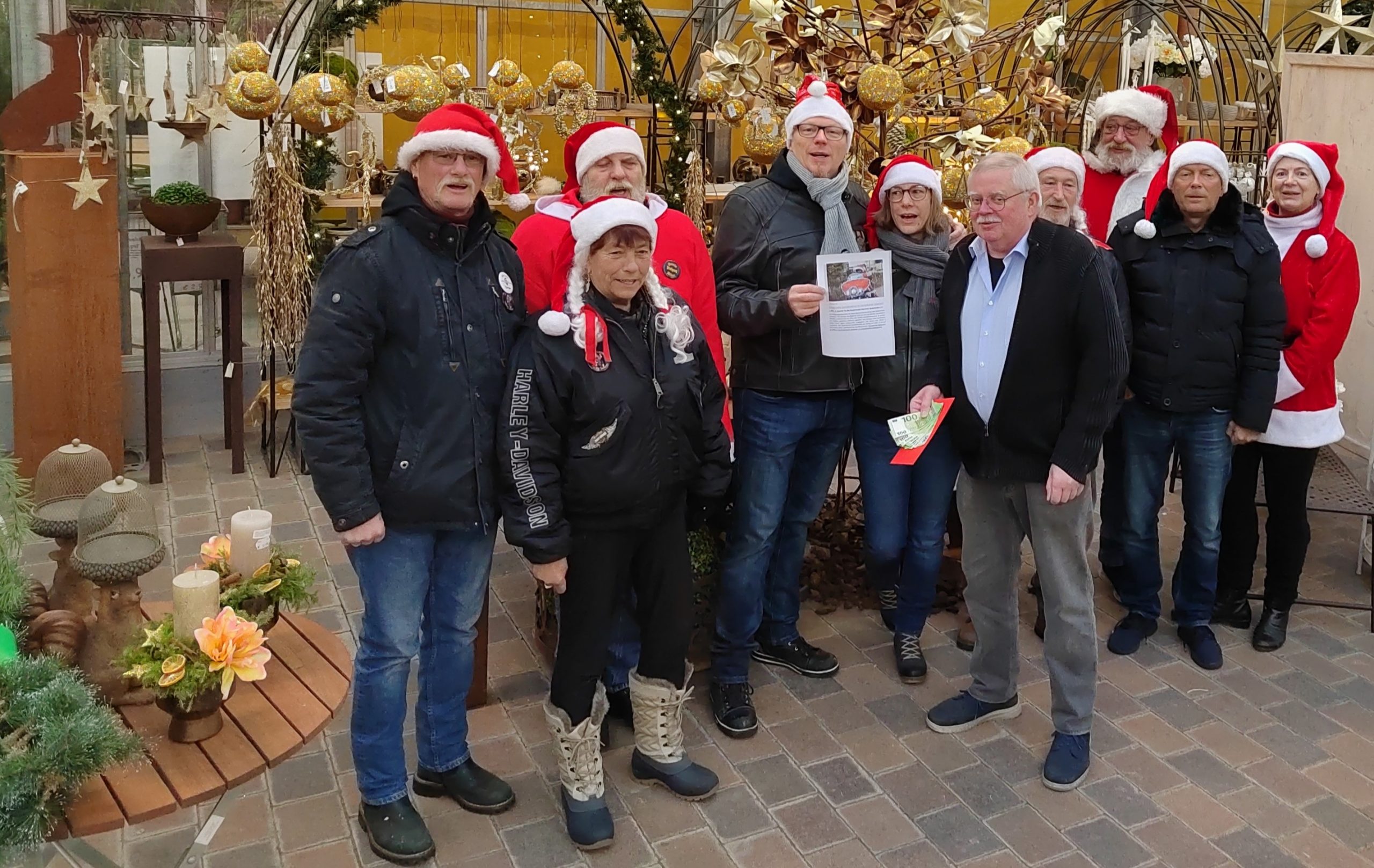 Am Nikolaustag  besuchten die Riding Santas auf ihren Harleys das GCE. Hier konnten die Nikoläuse nicht nur ihre prall gefüllte Spendendose mitnehmen, sondern auch  den Erlös  vom Waffel- u. Glühweinstand (Glühwein gestiftet vom Weingut W. Anselmann). Es kamen über 700,- € Spenden zusammen, welche das GartenCenter  auf  1000,- €  erhöhte und  den  Riding Santas  für das Kinderhospiz  Sterntaler e.V. in Dudenhofen überreichte.