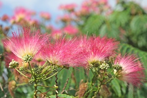 Seidenbaum (Albizia), Kreppmyrte (Lagerstroemia), Granatapfel (Punica), Zylinderputzer (Callistemon), und Bougainvillea werden ca. um ein Drittel eingekürzt, um kompakte Pflanzen zu erhalten.