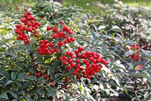 Bambus (Fargesia, Phyllostachys), diverse Gräser, Stechpalme (Ilex), viele verschiedene Nadelgehölze, Ahorn (Acer), Lavendelheide (Pieris), Japanische Weide (Salix), Rosen, Glanzmispel (Photinia).